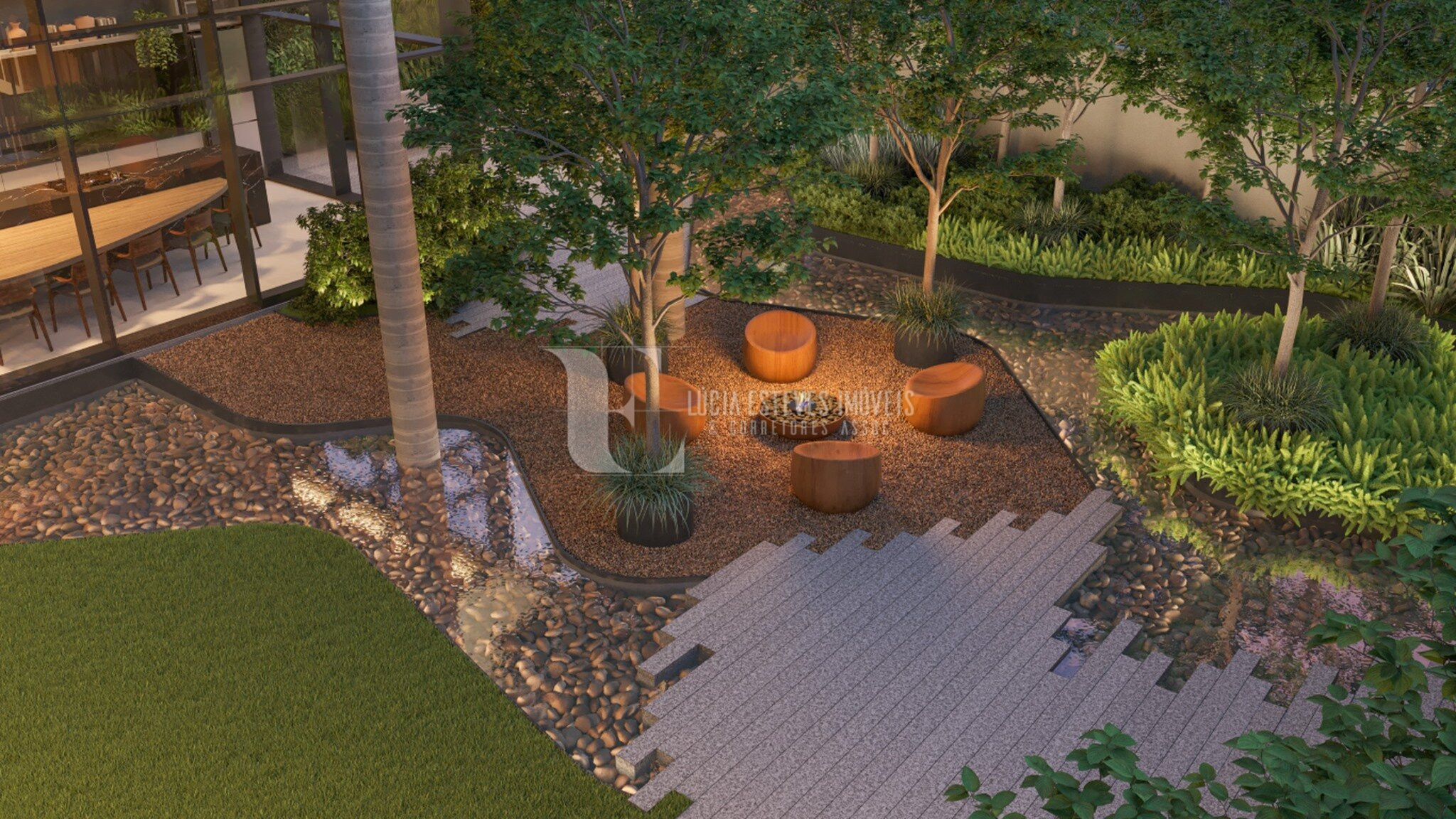 Jardim externo com piscina e estar externo