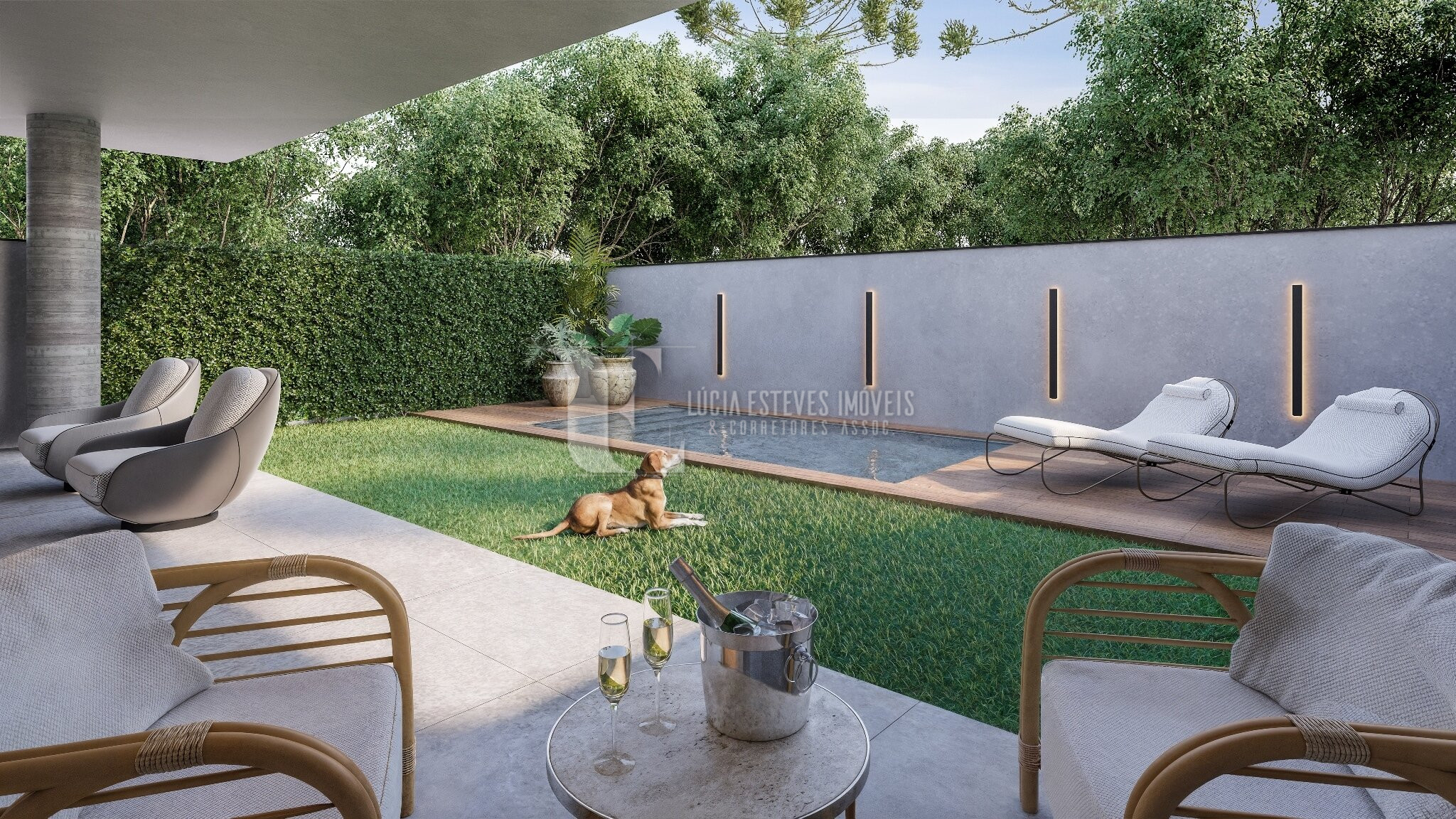 Amplo jardim com piscina