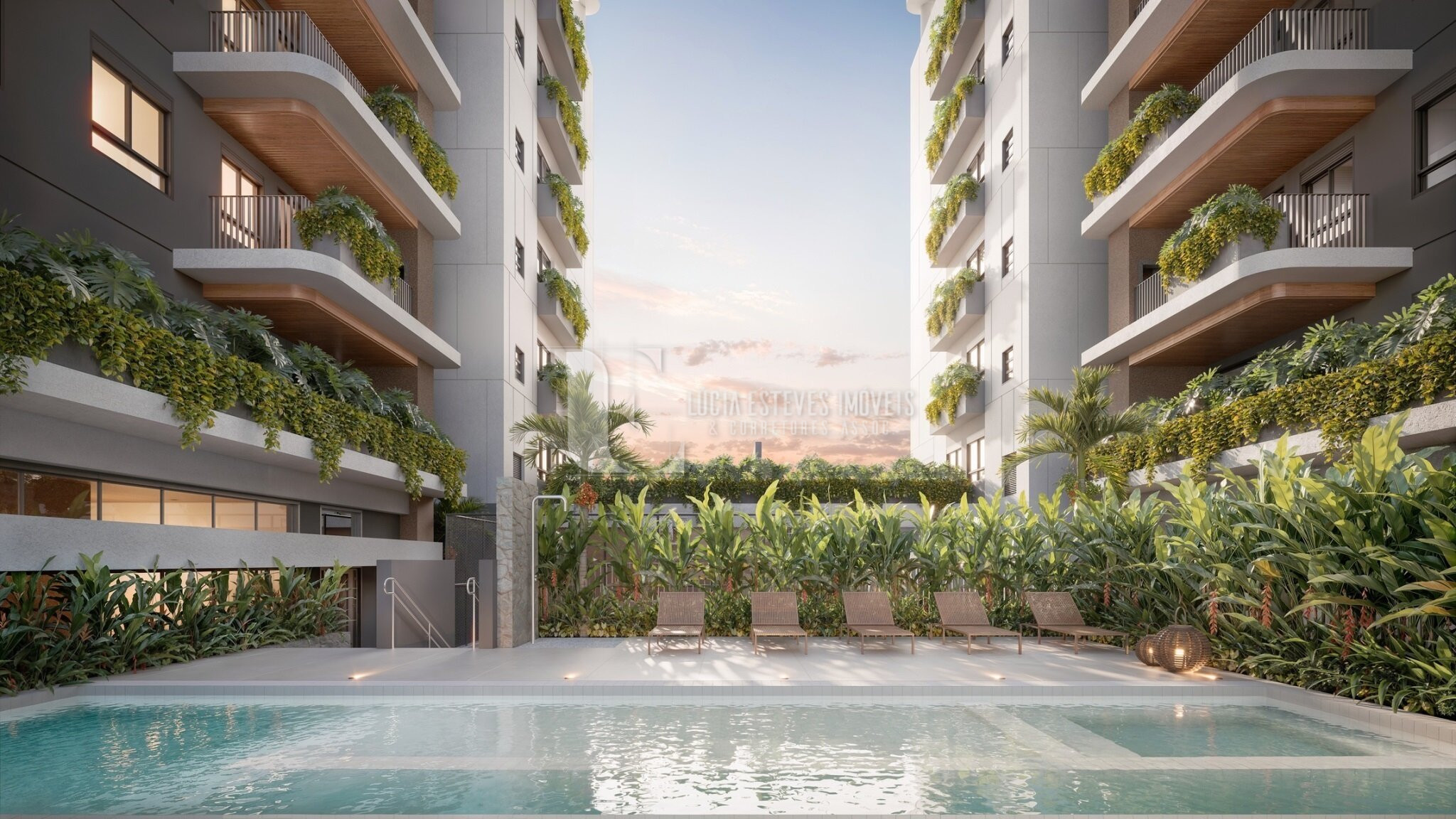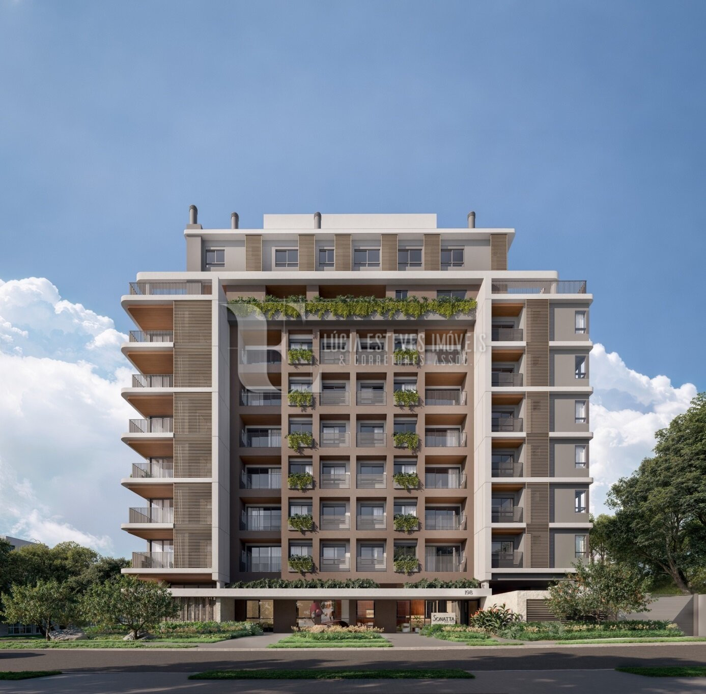 A arquitetura do Sonatta se organiza em duas torres, com uma praça central entre elas, revelando uma composição equilibrada e contemporânea.