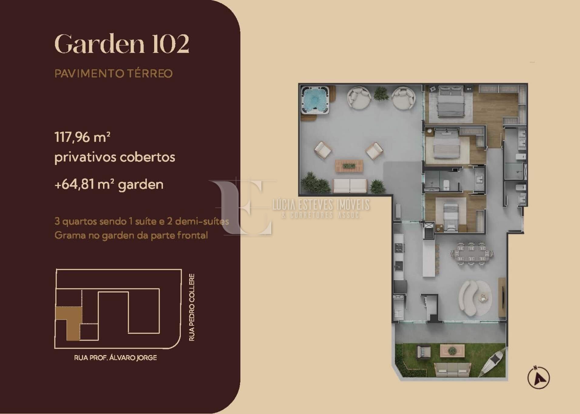 117,96m² de apartamento + 64,81m² de jardim exclusivo = 182,77m² privativos