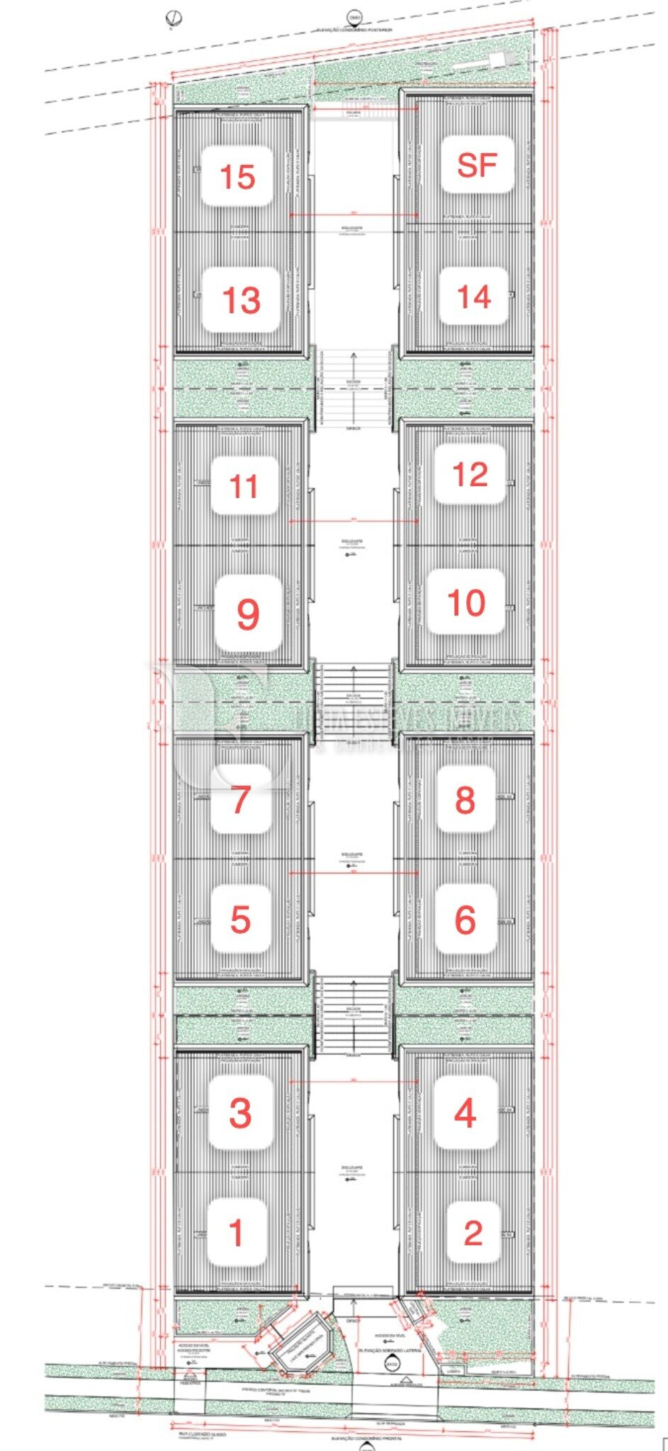 O condomínio contará com uma praça interna central equipada por floreiras e espelho d’água.